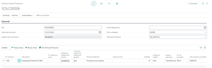 Para que el sistema proponga los productos de forma automática el usuario debe pulsar en la parte superior el botón SOLICITUD + SOLCITAR PRODUCTOS. El sistema incorpora todos los productos que tengan movimiento en el almacén determinado en la cabecera.